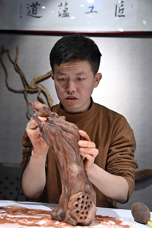 2月23日,手艺人在展览现场展示晋作木雕技艺。