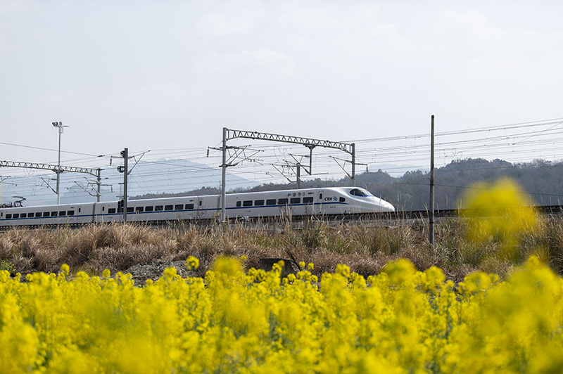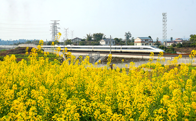 春暖花开时节,油菜花陆续盛开,列车穿行其间,美不胜收。
