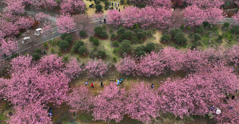 随着气温回暖,湖南省常宁市罗桥镇樱花园里的3000多亩樱花次第绽放,春色满园,吸引游客前来观赏游玩。