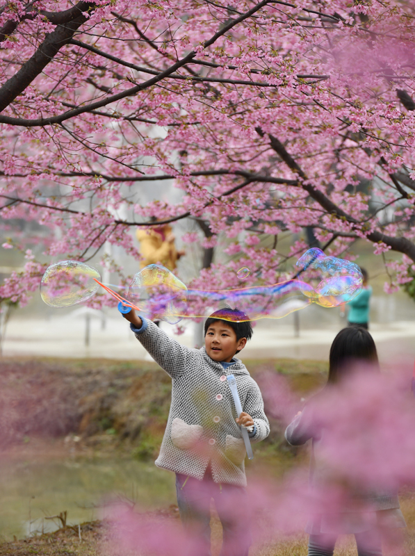 3月4日,小朋友在常宁市罗桥镇樱花园内玩耍。