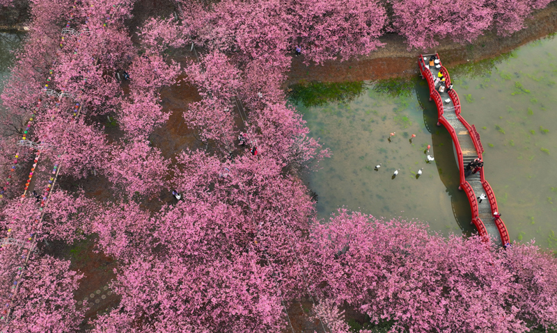 3月4日,游人在常宁市罗桥镇樱花园内观赏樱花(无人机照片)。