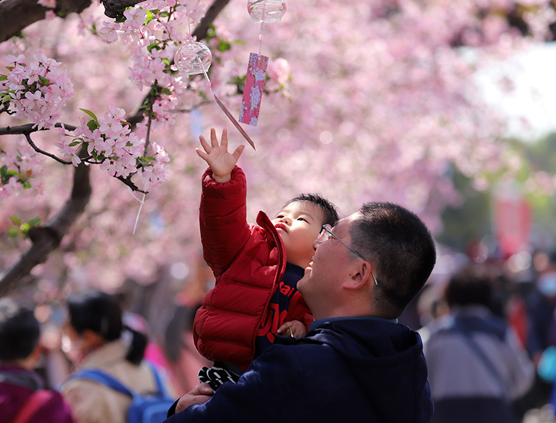 3月16日,小朋友和家长在南京市莫愁湖景区赏花。