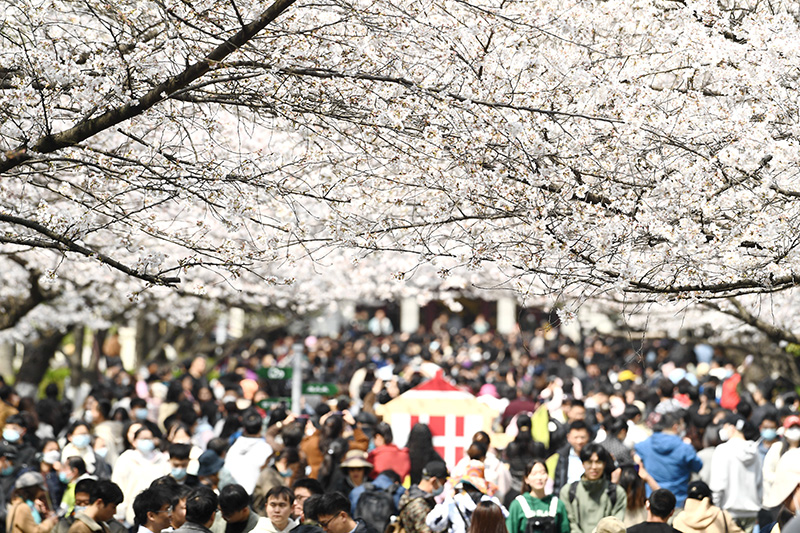 3月16日,人们在南京林业大学樱花大道上赏花游玩。