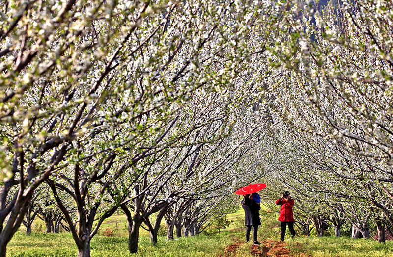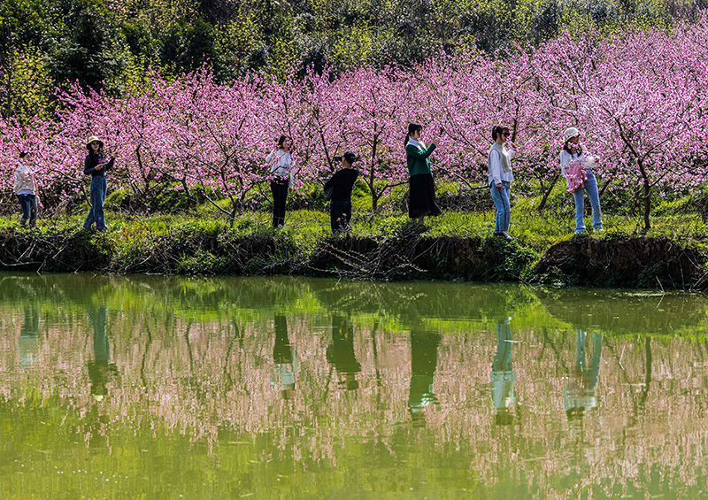 3月15日,游客在湖南省永州市蓝山县湘江源瑶族乡坪源村蓝山谷景区赏花拍照。