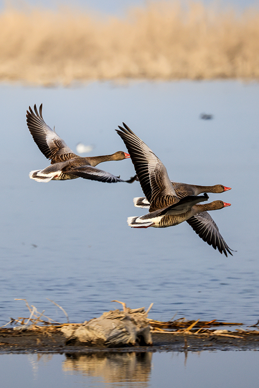 灰雁在新疆博斯腾湖水面上飞翔(3月17日摄)。