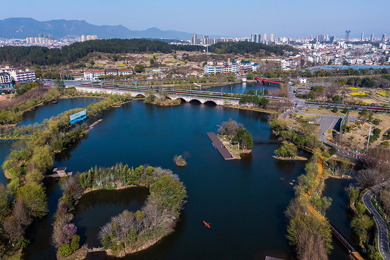 空中俯瞰浙江省金华市浦江县的翠湖(3月14日摄,无人机照片)。翠湖位于浦阳江城区段最上游,由翠湖为主、3个独立小湖泊、8个生态小岛组成浦江县最大的水环境湿地公园,是浦江“五水共治”工作成效的缩影。经过整治,翠湖曾经被严重污染的水体得到极大改善。为方便游客观光游览,湖边设有亲水平台、环湖绿道、生态走廊。