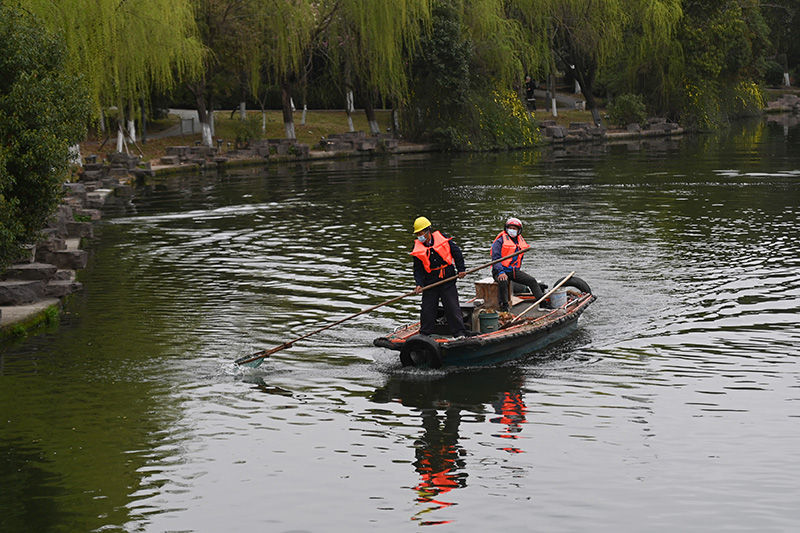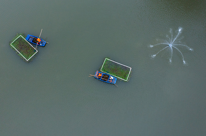 3月14日,在浙江省金华市浦江县浦阳江同乐段,工作人员乘船在打捞水面漂浮物(无人机照片)。该江段通过生态治理、河湖清淤、景观改造、种植水生植物等综合整治措施,利用河道右岸的落羽杉林,在渠道上铺设林荫栈道,栽种1400余株樱花形成1.5公里的樱花大道,造就一片春有樱花落英、秋有杉叶火红的四季美丽风景,满足群众赏景及亲水需求。