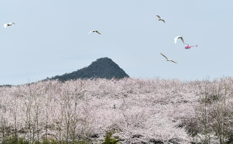 3月21日,一群鸟在贵州省贵安新区樱花园内飞翔。
