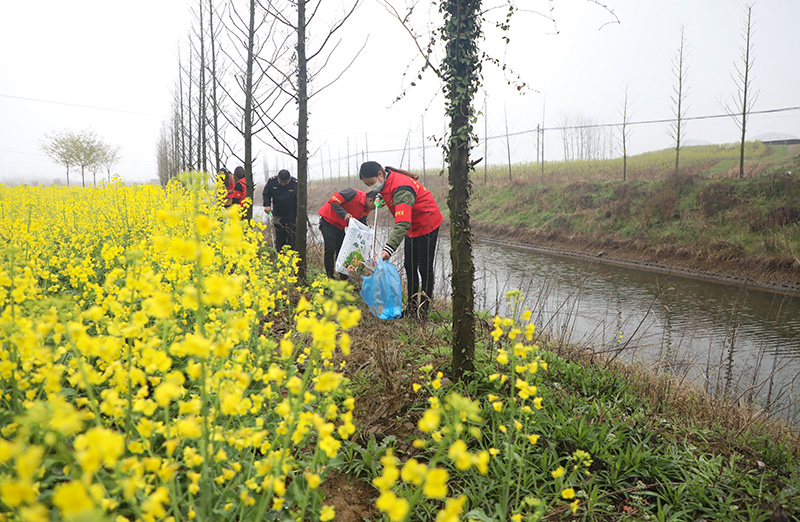 3月21日,在合肥市肥西县铭传乡,志愿者在天河河岸边清理垃圾。