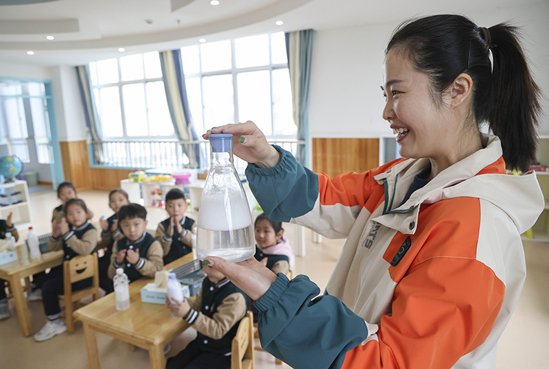 3月21日,浙江省湖州市长兴县龙山幼儿园的教师为孩子们讲解水循环知识。