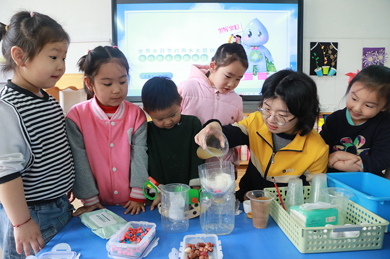 3月21日,山东省临沂市兰山区柳青街道中心幼儿园的老师为孩子们演示污水治理小实验。