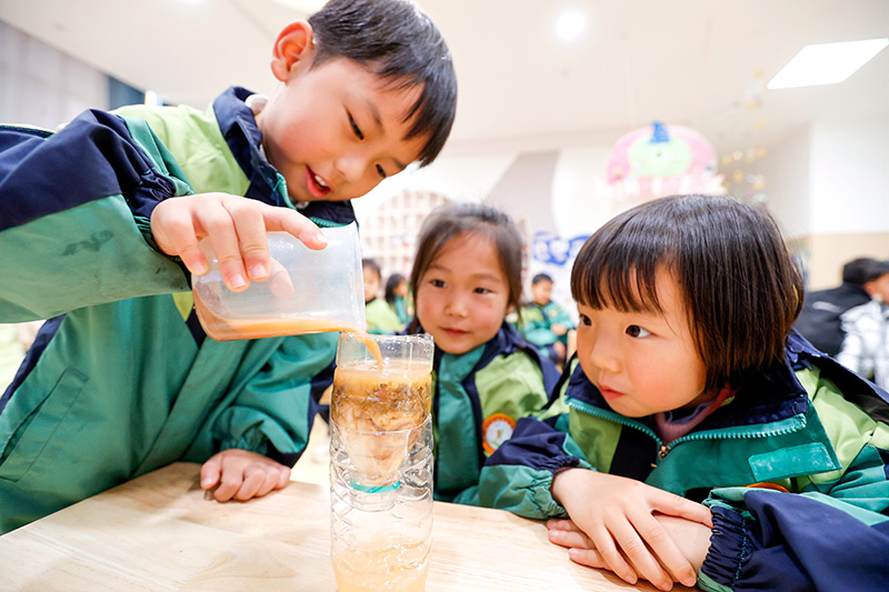 3月21日,在浙江省湖州市长兴县实验幼儿园科探室里,老师和孩子们一起体验压力井出水游戏。