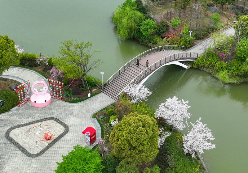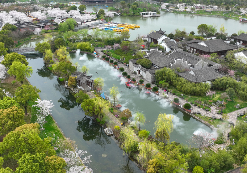 近日,浙江省宁波市植物园内的樱花、海棠、郁金香等竞相绽放,与垂柳、古建筑等相互映衬,构成一幅幅和美的春景。