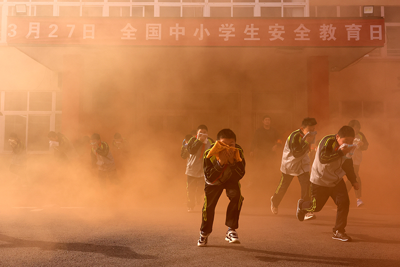 3月27日,河北省石家庄市沿西街小学学生在老师指挥下进行应急避险逃生演练。