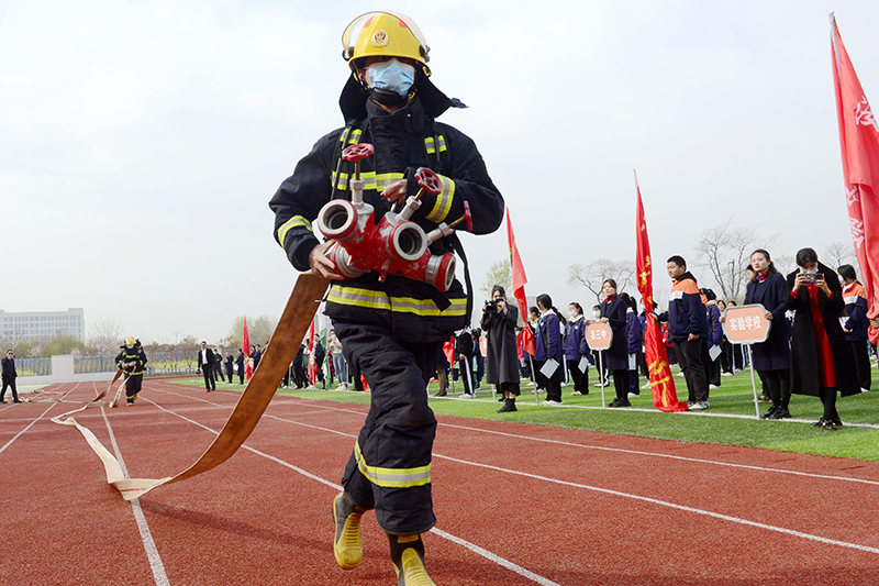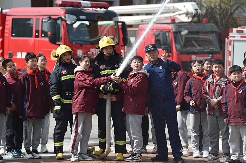 3月27日,在江苏省宿迁市苏州外国语学校,学生在消防员的指导下体验消防水枪。