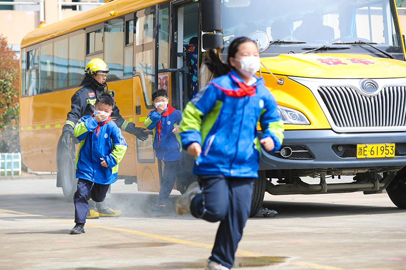3月27日,浙江省湖州市德清县三合中心学校学生在消防员的指导下进行校车应急逃生演练。