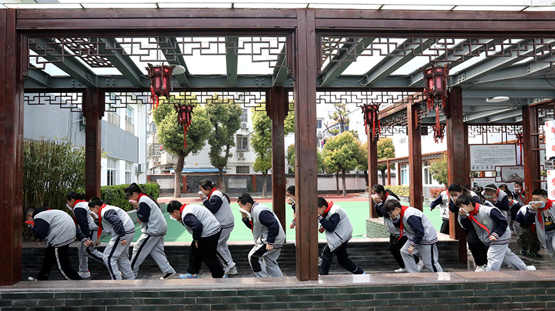 3月27日,在山东省枣庄市江山实验学校,学生进行消防应急逃生演练。