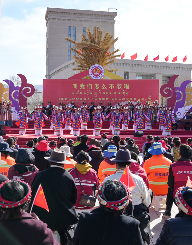 这是3月28日拍摄的日喀则市纪念西藏百万农奴解放64周年群众联欢活动现场。