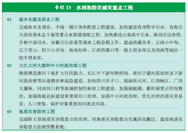 加强水利基础设施建设,在继续推进大江大河治理基础上,积极开展重要支流、湖泊和中小河流治理,增强城乡供水和防洪能力。健全防灾减灾体系,增强抵御自然灾害能力。