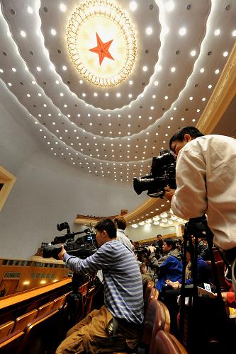 3月7日,全国政协十二届一次会议在北京人民大会堂举行第二次全体会议。这是媒体记者在会议现场采访。新华社记者 何俊昌 摄