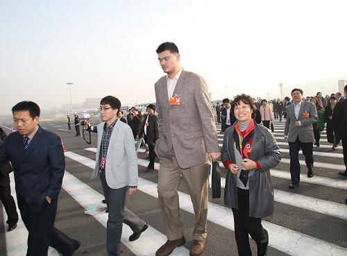 3月8日,全国政协十二届一次会议在北京人民大会堂举行第三次全体会议。这是全国政协委员姚明抵达天安门广场。 新华社记者 王申 摄