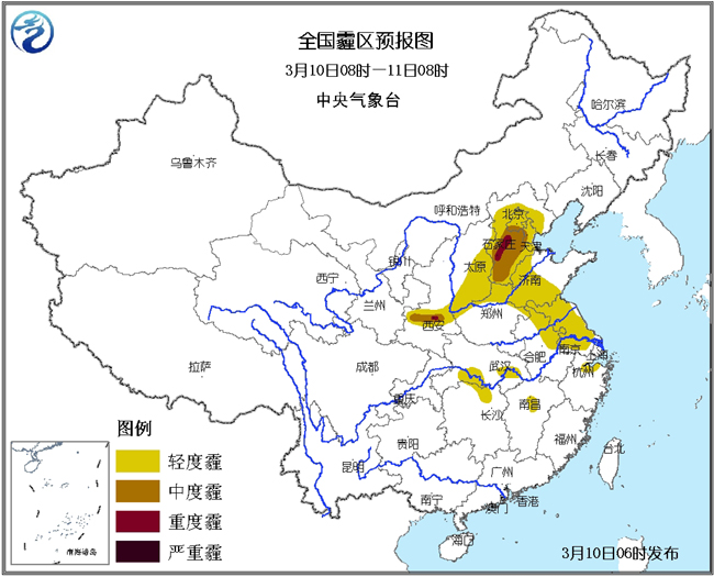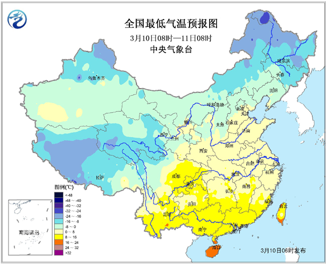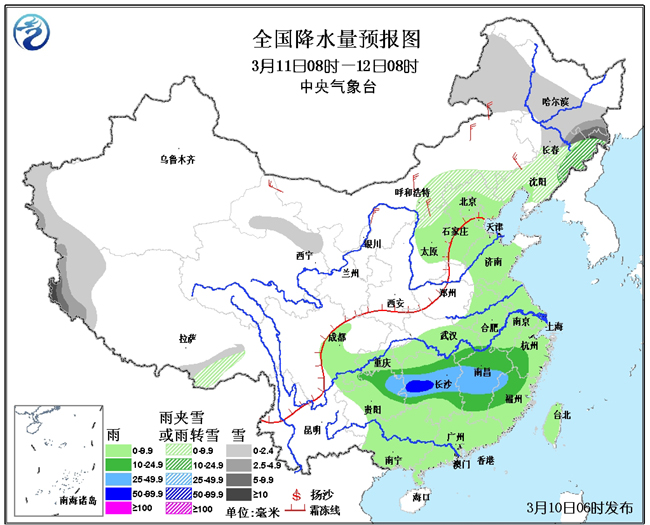 10日20时至11日20时,西藏西部和东部、内蒙古东部、华北北部、东北地区中南部等地有小雪(雨)或雨夹雪,西南地区东部、江南西部、华南大部等地有小到中雨。新疆东部、内蒙古中西部、甘肃中西部等地的部分地区有5~6级风,南疆盆地、甘肃西部等地部分地区有浮尘或扬沙天气。