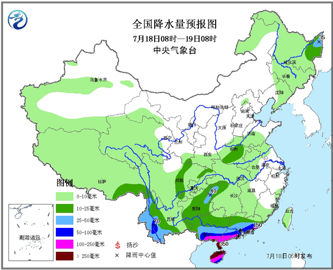 18日08时至19日08时,南海大部、西沙群岛及中沙群岛附近海域、琼州海峡、北部湾以及海南沿海、广东沿海、广西沿海将有7~9级大风,其中南海西北部、琼州海峡、北部湾、海南东部和北部沿海、广东西部沿海、广西沿海的部分海域或地区将有10~12级大风,台风中心经过的附近海域或地区的风力有13~16级,阵风可达17级以上;海南大部、广东南部、广西东南部等地有暴雨或大暴雨,其中,海南北部和西部、广东雷州半岛、广西沿海等地的局部地区有特大暴雨(250~350毫米)。(中央气象台7月18日06时继续发布台风红色预警,并发布暴雨橙色预警。)