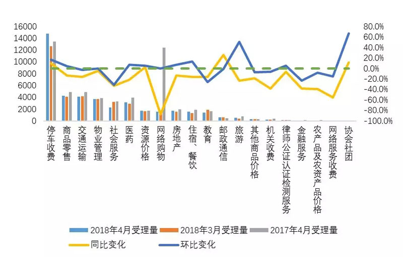 (三)热点行业分布。4月平台受理量排名前五的行业分别是停车收费(14773件)、商品零售(4286件)、交通运输(4088件)、物业管理(3669件)和社会服务(3434件)。与上月相比,住宿餐饮、旅游等行业的举报受理量上升明显,教育、金融服务行业的受理量明显下降,其他行业受理量则基本稳定。与去年同期相比,网络购物、机关收费、网络服务收费等行业的受理量明显下降。