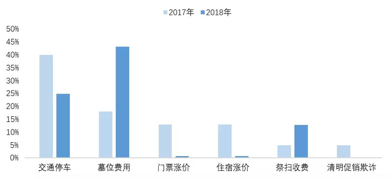 平台数据显示,4月殡葬行业价格举报受理量近百件,比上月增长近50%,与去年同期相比基本持平。与去年不同的是,墓园相关费用问题关注度持续走高,占43%,主要包括墓位管理费过高,墓园未按政府定价标准收费,未设立价格公示牌,违规收取刻字费、排位费、开穴费、进口烤瓷照片费等相关费用以及合葬墓位收取双倍管理费等。同时,祭扫费用相关问题受理量占比也有所上涨,占13%,主要包括修缮费用过高,违规收取烧纸钱费用,鲜花、纸钱、镇纸等祭祀用品涨价等。祭扫场所停车问题的关注度有所下降,占25%,主要集中在停车收费与客运涨价两大领域。此外,今年清明期间,墓地所在景区门票涨价、回乡扫墓当地酒店住宿涨价、清明促销欺诈等问题总占比仅2%,相关领域监管成效显著。