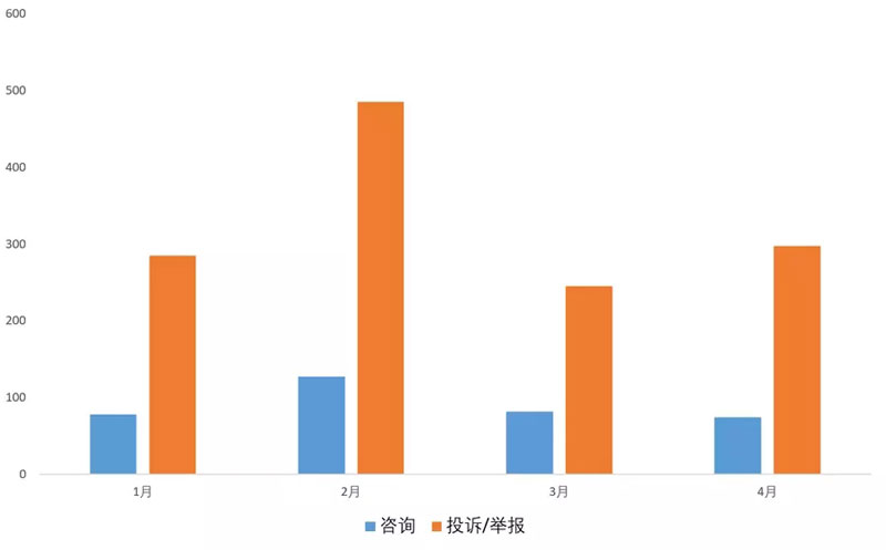 (一)全国12358价格监管平台受理情况。4月,全国12358价格监管平台受理价格举报、投诉、咨询共计60470件,环比上升17.6%,同比下降19.9%。其中,价格举报7461件,环比上升7.5%;价格投诉5066件,环比下降0.5%;价格咨询47943件,环比上升21.7%。