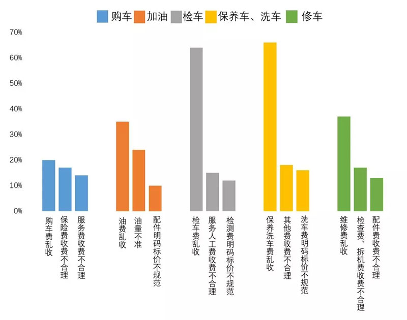 购车环节,存在购车费用过高,保险、综合服务费收费不合理等问题,其他问题如购车优惠陷阱,上牌费、手续费收费不合理以及贷款相关费用收费不合理等;加油环节,主要反映油费过高、各加油站收费标准不一致、油枪计费不准确等问题;检测环节,主要反映检车费过高、人工服务费收费不合理、检测费明码标价不规范等问题;保养、洗车环节,主要反映服务费、材料费、工时费、手续费等收费不合理,洗车费未明码标价等问题;维修环节,主要反映维修费、拆机检测费、配件费收费不合理等问题。
