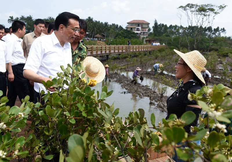 【李克强:环保也是生产力】11日,李克强在海南红树林保护区考察生态环保。了解到这里的红树林曾遭严重破坏,现在通过加大保护正在恢复,并吸引了大批游客来此旅游。李克强说,环保也是生产力。这里虽是红树林,却是绿色的,人与自然和谐相处,生态旅游带动了当地经济的健康发展。