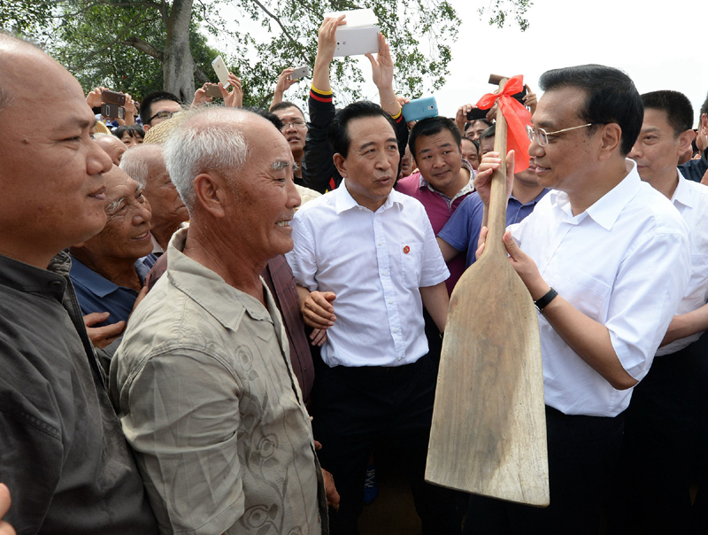 【渔民赠总理特殊礼物】11日,李克强总理在海南东寨港红树林湿地保护区考察生态保护。一位渔民将自己用了20多年的船桨赠给总理。李克强愉快地接过船桨说,我收下你的心意。为了保护红树林,建设绿色宝岛,祖居这里的渔民放弃打渔生活,作出牺牲,这支桨就是见证,应该把它珍存在红树林博物馆。