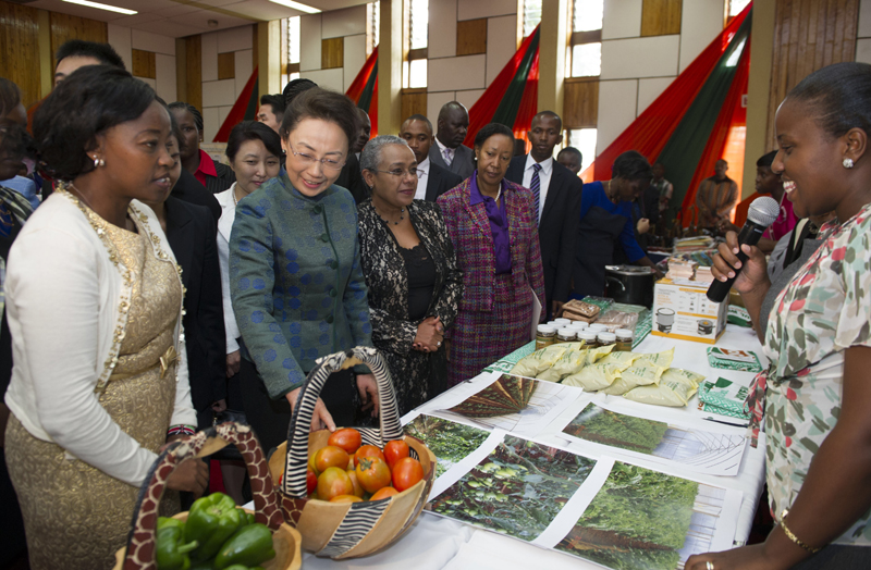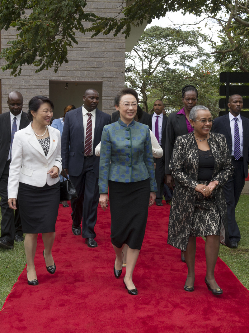 10日,李克强总理夫人程虹在肯尼亚总统夫人和副总统夫人的陪同下参观了快乐妇女组织。该组织用小额贷款支持农村妇女种植蔬菜、制作手工艺品等以提高家庭收入。程虹与受益于该组织的一些妇女交流,赞扬她们自食其力、补贴家用,还现场购买手工艺品以示支持。