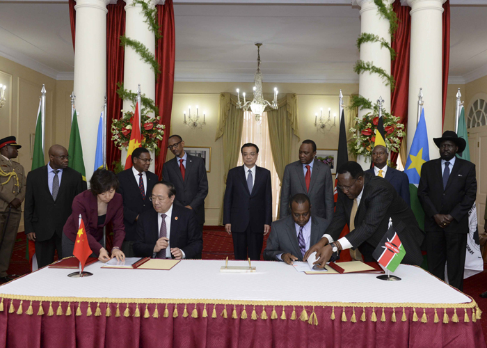11日,李克强总理和肯尼亚、南苏丹、乌干达、卢旺达四国总统,及作为总统代表的坦桑尼亚、布隆迪两国外长,共同见证了中肯蒙巴萨-内罗毕铁路合作协议签署。蒙内铁路是连接东非6国铁路网建设的开端,将完全采用中国的技术标准建设。