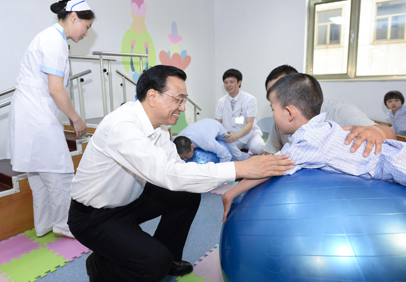 李克强同在场的医护人员交流,感谢他们的辛劳和付出。他说,残疾孤儿是社会上最弱小、最困难、最需要帮助的群体。你们从事的是天底下最崇高的事业,既要有精湛的医术,还要有高尚的医德。李克强勉励他们,不仅要治愈残疾孤儿生理上的病痛,也要拂去他们心理上的阴影,更好地向社会传递大爱和道德力量。要使更多残疾孤儿得到有效救治,点燃他们人生的希望,让每个孩子脸上都挂着舒展、天真的笑容。