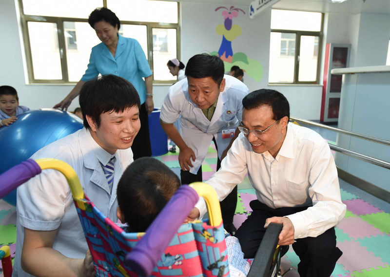 在康复专区,李克强高兴地看着患儿们正在医护人员的帮助下,通过医疗辅具开展康复训练。他拉起身边孩子的手,与他们交谈。他弯腰扶住一个在做腿部训练的孩子,关切地问恢复得怎么样,鼓励孩子坚持锻炼,战胜疾病,将来走得更好。