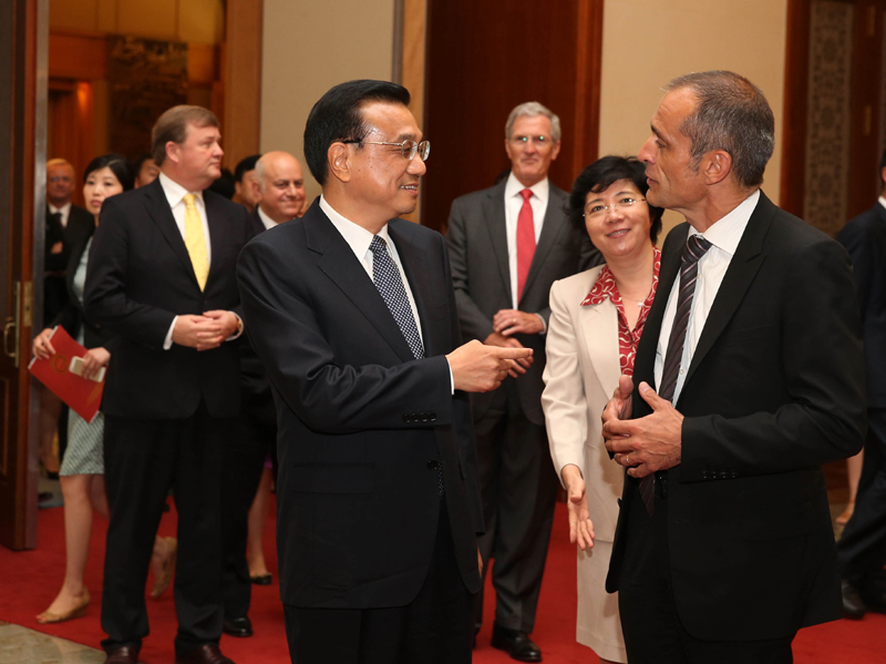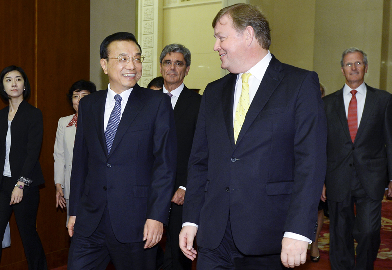 7月9日,江南平台入口 总理李克强在北京人民大会堂会见出席全球首席执行官委员会第二届圆桌峰会的代表并座谈。这是会议结束后,李克强与出席峰会的外方代表交谈。新华社记者 刘卫兵 摄