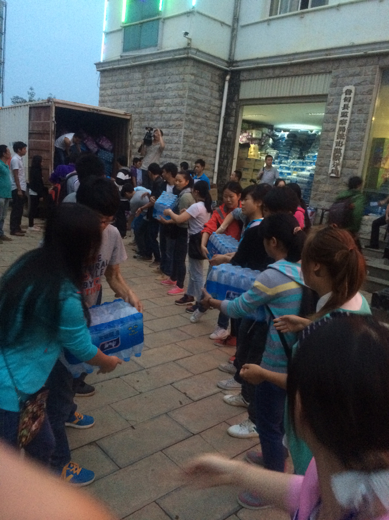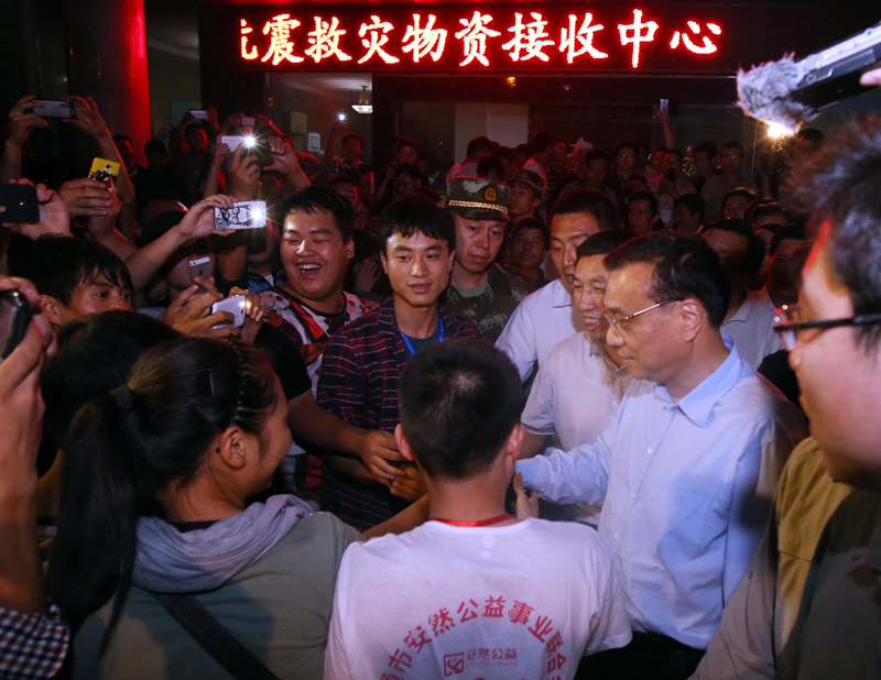 【李克强赞灾区志愿者:齐心协力定能取胜】李克强4日晚来到鲁甸县民政局察看救灾物资调运。院子里不少回家过暑假的大学生组成志愿者,手手相传把矿泉水、方便面等物资装到发往灾区的车上。李克强肯定大家做的是大好事,齐心协力定能取得抗震救灾的胜利。