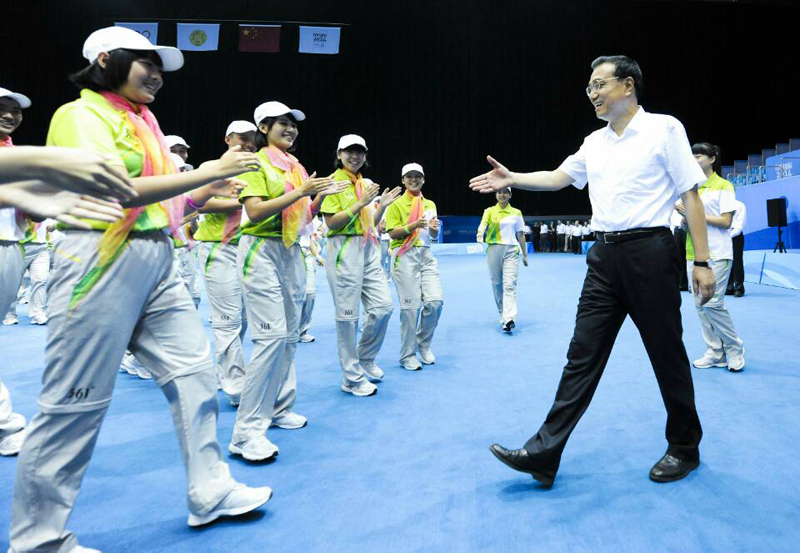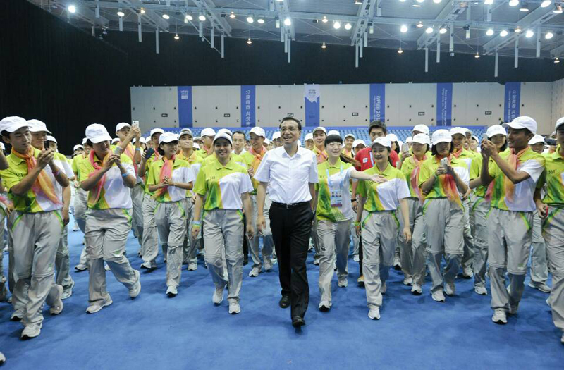 大厅里,几百名志愿者正在为闭幕式演出进行紧张排练,看到总理,他们纷纷围拢过来,李克强祝大家在闭幕式上的表演成功,为青奥会画上圆满的句号。他说,青奥会志愿者绝大多是学生,但也有一些中老年人,这说明志愿者精神吸引了不同年龄的人。国家要发展,老百姓要过上好日子,不仅要有物质发展,还要有精神追求,你们的志愿服务,展现了乐于助人、甘于奉献、敢于担当形象,青奥会不仅是运动员相互竞技的赛场,也是志愿者彰显社会道德力量的平台。你们作为无名英雄,虽然没有奖牌,但挂在胸前的服务标牌就是奖牌。他勉励大家更好地弘扬“奉献、友爱、互助、进步”的志愿者精神,汇聚起推动社会进步的巨大力量,为实现“两个一百年”的奋斗目标和中华民族伟大复兴的中国梦、为促进世界各国人民特别是青年之间的友谊而不懈努力。