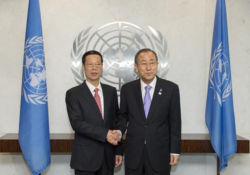 张高丽首先向潘基文转达习近平主席、李克强总理的亲切问候,并转交了习近平主席致潘基文的信。张高丽说,中方高度赞赏潘基文秘书长倡议召开联合国气候峰会,相信峰会将对应对气候变化国际合作产生重要和积极影响。中国政府和中国领导人高度重视应对气候变化问题,高度重视联合国在此方面的作用。中方愿继续加强与联合国的合作,将提供600万美元支持联合国秘书长推动应对气候变化的南南合作。