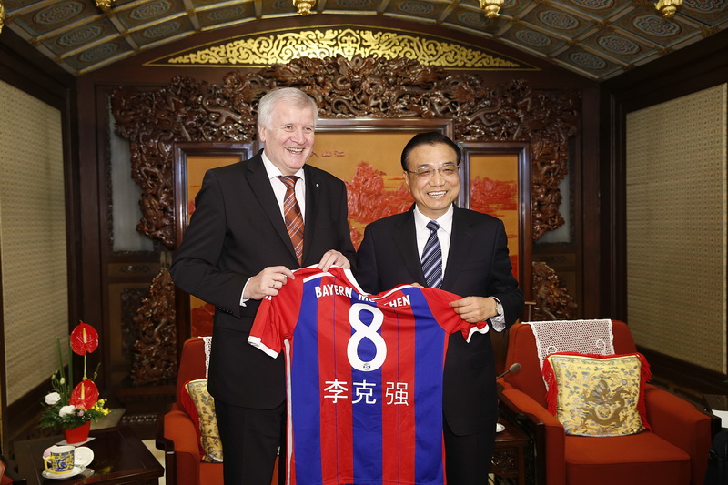 【李克强获赠拜仁慕尼黑队球衣】11月24日,李克强总理在中南海会见来华访问的德国巴伐利亚州州长泽霍夫时,双方谈及中德足球合作。泽霍夫表示,拜仁慕尼黑足球队希望明年来华比赛,并愿帮助中国培训有潜力的球员,希望有一天德、中两国足球队能在世界杯决赛赛场上竞技。李克强回应说,中国愿意同德国加强体育合作,中德联合对双方和世界都是机遇。随后,州长向总理赠送了印有李克强名字、并由全体球员签名的拜仁慕尼黑队8号球衣。