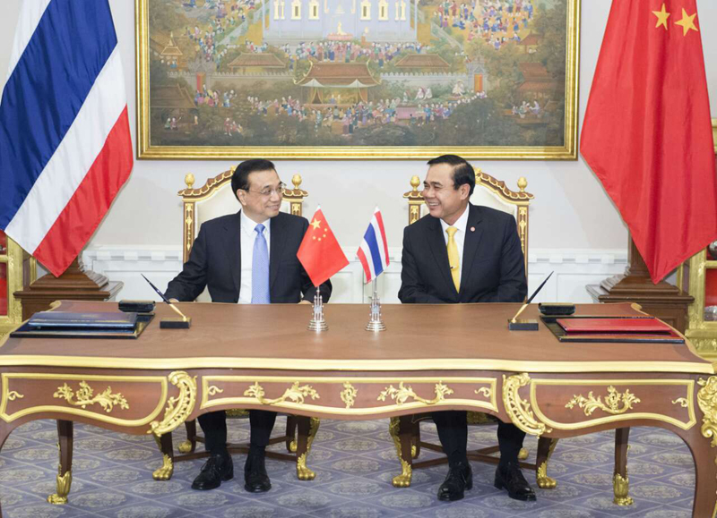 李克强总理19日下午在曼谷会见泰国总理巴育。他们共同见证了中泰铁路和农产品合作谅解备忘录的签署。这两个备忘录是去年两国所签相关协议的扩充、延伸和进一步确认。李克强说两国将在泰建设长达800公里的首条标准轨铁路,这将有利于整个地区互联互通。