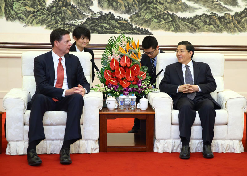 3月14日,国务委员、公安部部长郭声琨在北京会见美国联邦调查局局长科米。新华社记者 丁海涛 摄