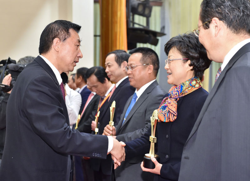 3月29日,第二届中国质量奖颁奖大会在北京召开。这是国务委员王勇为获奖的组织和个人颁奖。新华社记者 李贺 摄