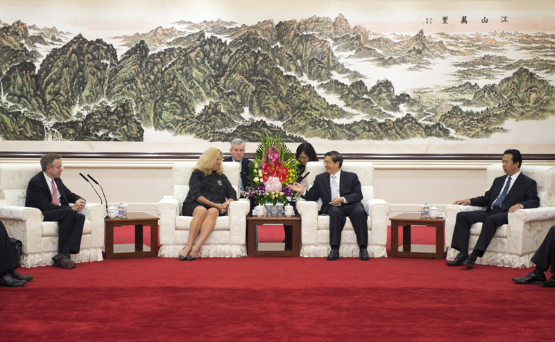 6月14日,国务委员、公安部部长郭声琨在北京会见美国国土安全部副部长斯波尔丁、司法部助理部长帮办斯沃茨。新华社记者 谢环驰 摄