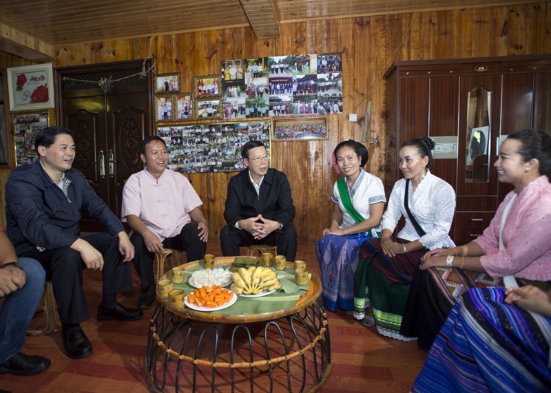 这是11月8日,张高丽在景洪市勐养镇曼掌村看望少数民族村民,调研少数民族新农村建设。新华社记者 王晔 摄