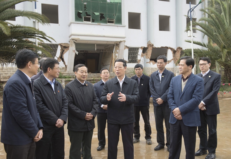这是11月7日,张高丽到昭通市鲁甸县实地考察龙头山镇原镇政府地震遗址。新华社记者 王晔 摄