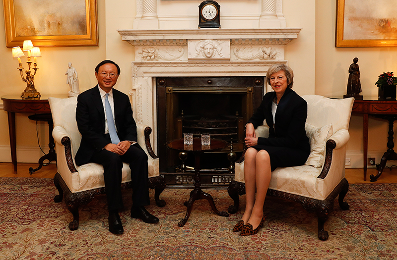 12月20日,英国首相梅(右)在伦敦会见到访的中国国务委员杨洁篪。新华社记者 韩岩 摄