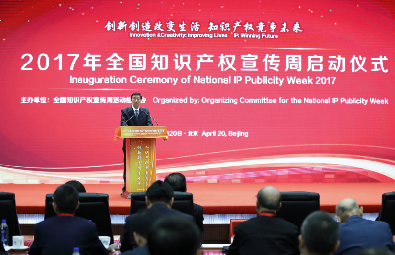 4月20日,2017年全国知识产权宣传周活动在北京启动,国务委员王勇出席启动仪式并讲话。新华社记者 丁海涛 摄